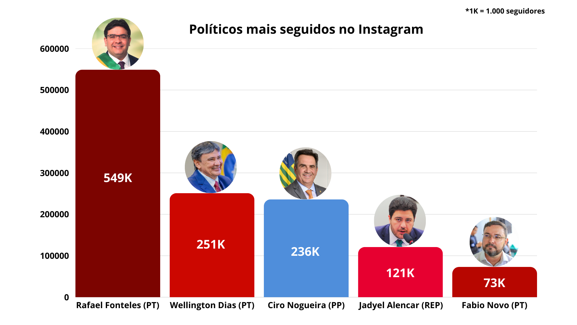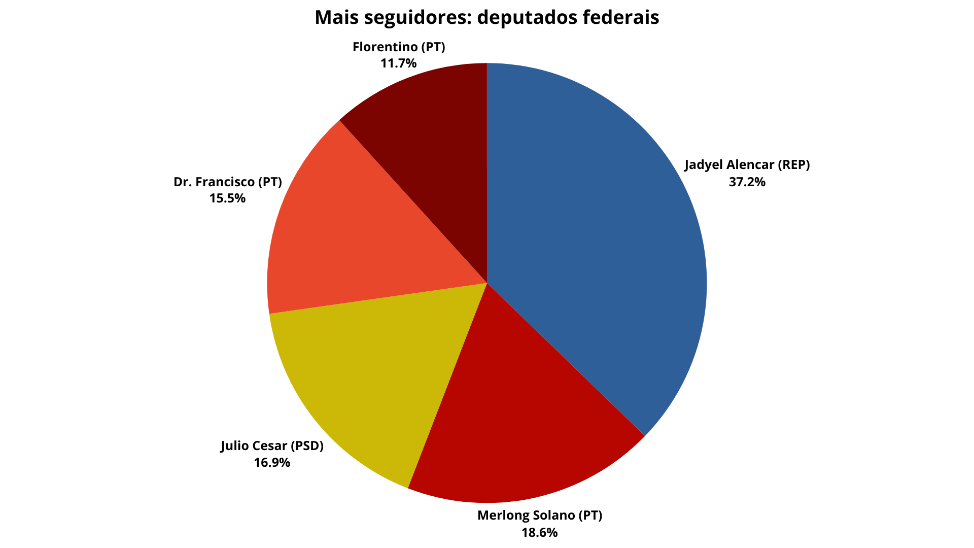 Na bancada de deputados federais do Piauí o líder no Instagram é Jadyel Alencar (Republicanos ) com 121 mil seguidores e uma ampla vantagem sobre os demais. Na sequência vêm Merlong Solano (PT), com 60,5 mil, e Julio Cesar Lima (PSD), que soma 54,9 mil seguidores. O grupo dos cinco mais seguidos se completa com Dr. Francisco (PT), com 50,4 mil, e Florentino (PT), com 38,1 mil.