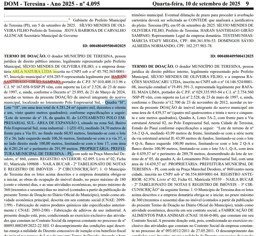 O decreto municipal em que consta a doação da Prefeitura de Teresina, através do prefeito Sílvio Mendes, para a empresa Arla Natural LTDA, representada por Haran, foi publicado na página 9, do Diário Oficial do Município de Teresina, na data de 10 de setembro de 2025.